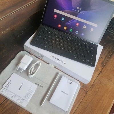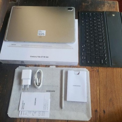 Samsung Galaxy Tab S7 FE SM-T736B 5G Resmi SEIN. Warna Mystic Black kondisi mulus 98% ada bekas pemakaian wajar di bezel bekas penempatan case, lengkap ori normal. Ada opsi pembelian termasuk keyboard orinya.
